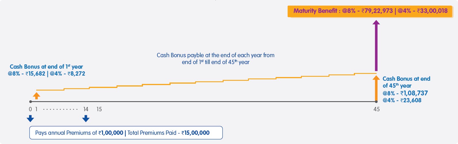 Rahul shall receive Cash Bonus, if any, from the end of 1st policy year till the age of 85 years, which will provide a supplementary income for his family.
