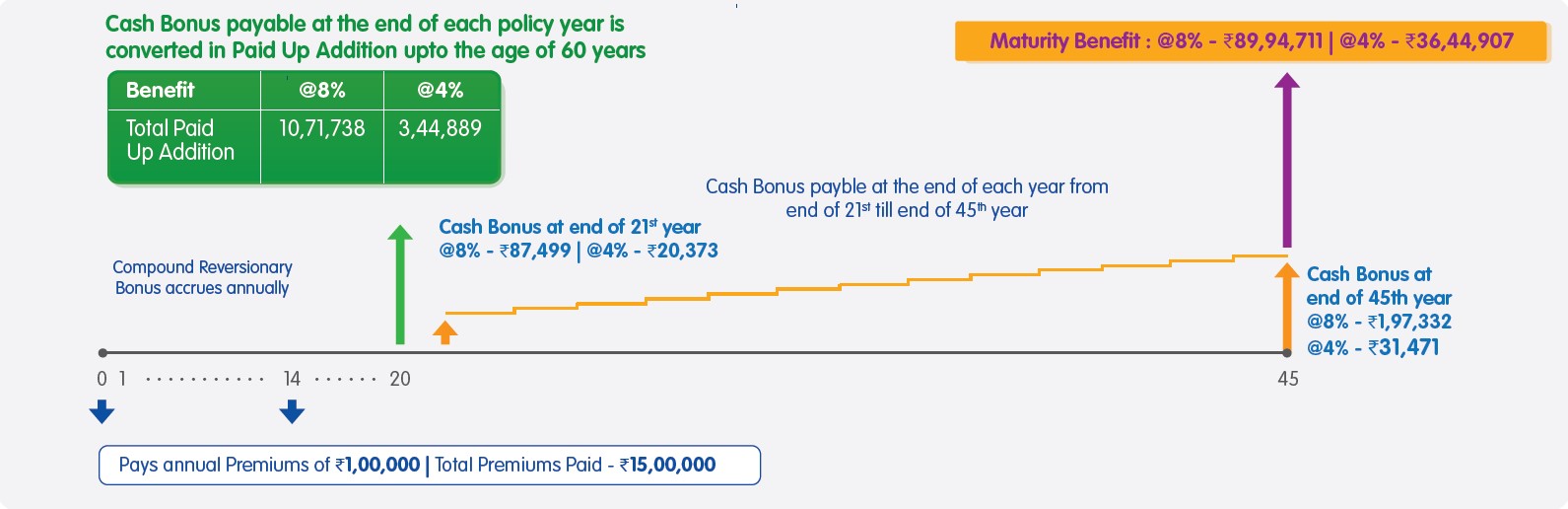 Rahul decides to convert the Cash Bonus, if any, into Paid Up Addition (PUA) up to the age of 60 years and receive enhanced income from the age of 61 years.
